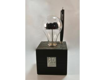 The locomotive in the light bulb is quite suitable as a eye-catching decorative piece on any desk. A shaped base of precious stone forms the foundation. The light bulb together with the class 89 tank locomotive placed inside it is mounted on the base. In addition, a high quality ballpoint pen as an exclusive writing implement is included. How the locomotive got through the narrow neck of the light bulb will remain Märklin's secret.