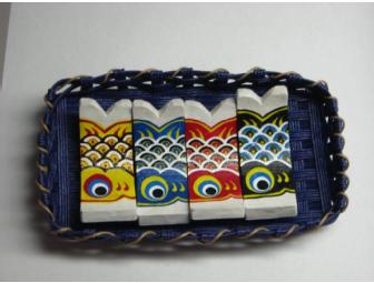 Set of four fish design chopstick holders in a basket container.