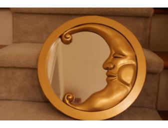 This beautiful round mirror features a metallic gold finish. The crescent moon frame design will add a whimsical touch to your room and makes an eye-catching accent in a hall or entryway.