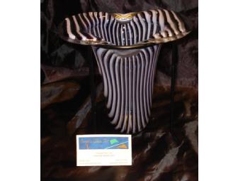 Bid now on this lovely glass art-drop vase created by Sarah Cawn. This vase was created by cutting strips of glass and fusing them to form a plate. A second process takes place in a kilm where the fused plate is slowly heated to allow the glass to soften and drop down forming the vase.