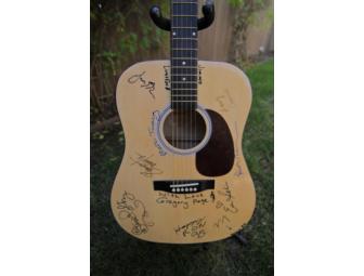 A fine finish natural acoustic guitar elegantly signed by local San Diego musicians; Gregory Page, Steve Poltz, Jimmie Lunsford, and Veronica May, Cactus Twang, and Eve Selis.