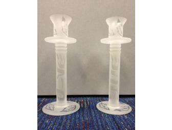 Kiddush cup measures 5" tall with a diameter at the top of 3.5" and 1.75" at the base. Candlesticks measure 8" tall with a 3.57" base diameter.