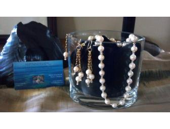 The jewelry set consists of a necklace of 32 pearls enhanced with gold beads and Swarovski crystals. It is 16'' long and has a 1 1/2" gold chain extender. The matching earrings are made up of 3 pearls each hung from gold chains attached to fishhook ear wires.