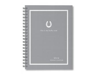 The Horseshoe planner features a metallic silver cover with a white horseshoe with the text: “this is my lucky year”. The front and back covers are folded over and printed on the inside and outside. It is spiral bound with a silver metal spiral and the interior pages are printed in chocolate brown. This is a lucky planner for 2012!