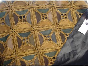 The combinations of colors, patterns and crocheted stitches are unique to each garment. The wrap is triangular and measures approximately 5 ½ feet wide by 3 feet long at the point.