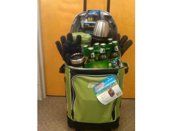 Everthing you will need for your next tailgating experience! Includes a cooler on wheels, beer, gloves, blanket, mugs and more!