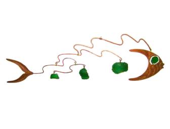 TANGUERAY TANG is a unique GEO-KINETIC sculpture created by local artist Larry Lipsky. This piece is made from recycled copper and tumbled glass. The piece is aptly named TANGUERAY TANG for the vibrant green glass pieces that are incorporated in the work, which came from a Tangueary bottle. Gin lovers can appreciate the name, but everyone can appreciate this beautiful peice! This piece measures 30 inches long by 9 inches high. For more of Larry's work, visit Bajo el Sol In Mongoose. Check it out at www.bajoelsolgallery.com