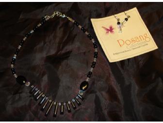 Bid on this vibrant necklace and earring set from the Posange Collections features semiprecious stones and Swarovski crystals. Black with clear Swarovski stones. Necklace measures 18" with extension chain to 21"