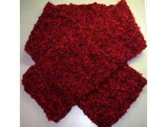 Warm and fuzzy hand-knit 100% acrylic scarf.