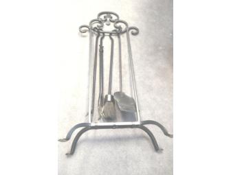 Bid now on this five piece set features a poker, shovel, tongs, broom, and stand, for all your fire cleaning needs.