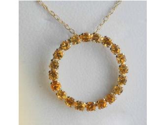 This delicate cetrine necklace with a fine gold chain has a half-inch circle of yellow stones. Cetrine resembles topaz, and some people believe it has healing qualities.