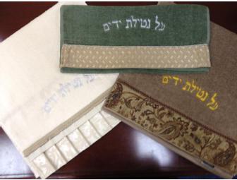 Army Green, Cream, and Light Brown towels with decorative trim.
