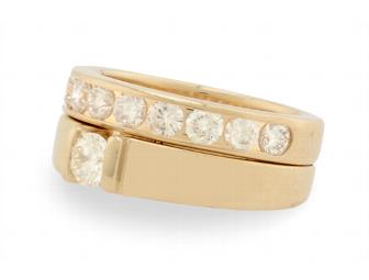 Ring Specs: The item is a 14 karat yellow gold and diamond engagement ring and band that was cast and constructed. The engagement ring features one diamond weighing approximately 0.20 carats. The diamond is J in color, SI2 in clarity and is channel set. The band contains 10 round brilliant cut diamonds that weigh approximately 0.80 carats total. The diamonds are G-H in color, VS2 in clarity, and are channel set. The rings are soldered together and have a high polish finish. The width is 7.5mm at the tallest point and tapers down to 6mm.