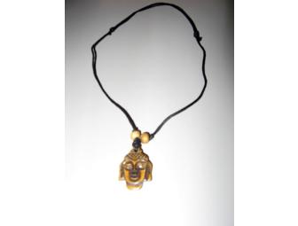 This whimsical necklace has a ceramic pendant and a knotted cord that expands to fit over your head. The pendant is approximately 1" wide and 1" long.