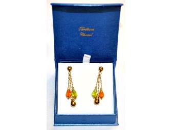 Three teardrops -- one gold, one green citrine, and one amber citrine -- dangle on 14K gold chains. Add these to your ensemble and dress up any holiday outing -- parties, shopping, socializing -- in style!