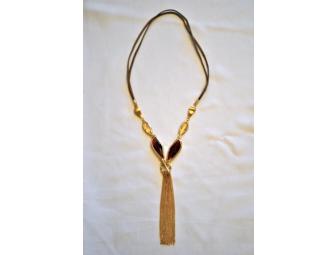 Put a new twist on your wardrobe with this lariat-style necklace. Sueded double cording links brushed gold accents, faceted stones in smoky and golden amber tones and a lariat loop, ending in a cluster of gold chains. 13” drop to the loop; 18” to bottom of tassels.