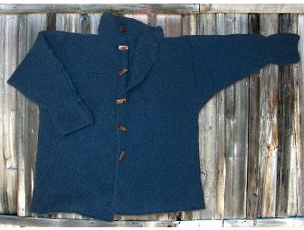 Incredibly cozy and soft, handknit sweater jacket in a ladies size large. Hand knit from soft deep cerulian blue Merino and mohair yarn and with colorful wood buttons.