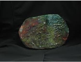 This oblong Raku Ware measures 7"x12" inches and is a unique piece of art work ready to be hung in a prominent spot in your home.