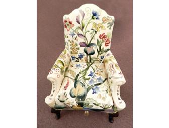 The original owner, Marion J. Inett completed the crewel work in 1965 after taking private lessons from a woman in Petersham, MA.   Mrs. Inett bequeathed the chair to her son and his wife after her death in  1972. The chair was donated by Dr. Richard O. Gifford to Tower Hill Botanic Garden in memory of his wife Elizabeth Murch Gifford.