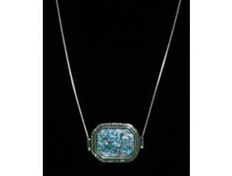This piece is accompanied by a certificate of authenticity. The chain measures 18" and the silver framed piece of glass measures 1 1/8" x 7/8".