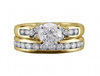 Ring: Specs:This piece is a yellow gold lady's wedding set that weighs 8 grams total. The band contains 16 channel set round diamonds and 6 prong set round diamonds, that are G in color VS-2 in clarity. The weigh a total of .70cts. The engagement ring contains a round brilliant cut 1.0ct diamond, F-G in color and SI-2 in clarity.