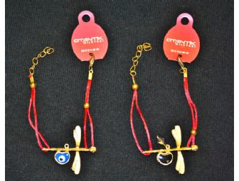Each of these delicate bracelets are adorned with a golden dragonfly charm that will appear to have settled on your wrist but actually is held in place with silken crimson cords and secured with a lobster-claw clasp. The dragon flies are individually adorned with additional charms or enameled stone accents (one of the bracelets is missing a small gem charm). The perfect friendship gift -- keep one and give another to someone you love -- or let them both flutter on your wrists!
