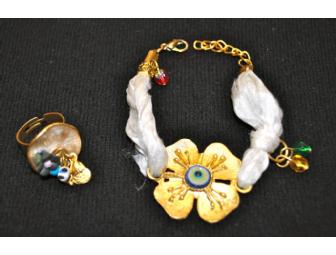 A delicate flower blossom rendered in a ivory enamel finish is captured on a matching ivory ribbon and enhanced by gold accents. The set is completed by a matching ivory blossom ring on an adjustable gold band adorned with two small charms.