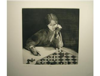 Own this lovely and unique aquatint etching of a young woman playing chess. The piece measures 23 1/2" x 24." It is archivally framed in ebony stained hardwood with acid free backing and mat.