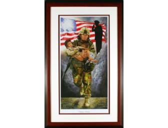 This is a limited edition lithograph, signed and numbered by the artist, Angelo Marino. Joseph Dwyer symbolized the conflict of combatants as he carried an Iraqi child to safety at the risk of his own life. This brave soldier eventually lost his own life at the age of 31. Part of your purchase will go to help victems of Post Traumatic Syndrome.
