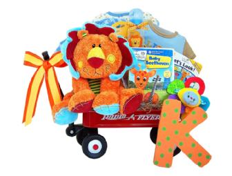 Who's King of the Jungle? New baby of course! This enormous Radio Flyer wagon designed by KaraNessian is packed with adorable animals from the jungle. Baby will learn from lions, giraffes, elephants and butterflies. Our enormous 14" colorful plush lion has so much personality, he is sure to delight new baby day and night!