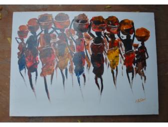 "Ni Kulga" is a greeting to a group of women after they have fetched water and are headed back to the village. This trip to and from thier local water source is made several times a day and each bucket of water can weigh up 44lbs. This painting depicts the amazing strength of Ghanaian women!