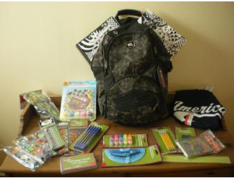 This sturdy boy's backpack is jam-packed with school supplies and other fun stuff for kids -- pencils, pens, notebooks, small toys, a navy blue America t-shirt, and much more! (Note: the filled backpack is heavy and holds many more items than could be pictured in one photo.) This would be an amazing holiday gift for any student, school, or PTA! Generously donated by Michael's.
