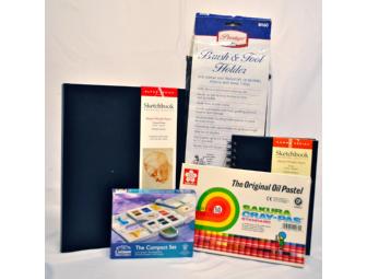 This basket provides some fantastic supplies for the budding Artist: archival quality sketchbooks, oil pastels, Windsor & Newton water color compact and a brush and tool holder.