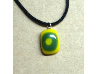 1/2" by 3/4" fused glass pendant on black cord.