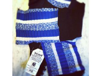 A one-of-a-kind scarf made by designer Charles Edward Powers. Scarf is made form recyled sweaters using wool, polyester and cotton. #018 blue, white and black.