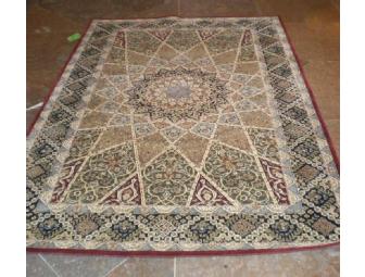 Colorful Sino-Persian tufted rug with red border and navy blue background, measures 5'6" x 8'6".  Made in China.