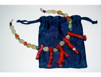 This one-of-a-kind red coral necklace features citron colored quartz beads and sterling silver findings--a brilliant and unique piece that will make a great addition to your accessory collection! The necklace measures 15" in length. Value: $125