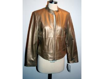 Leather is so luxurious! This size 10 jacket is 100% lamb leather with a polyester lining. Stitched details around the waistline give the jacket a flattering feminine shape. The leather is tan with a slight metallic sheen, creating a piece that will definitely glam up any outfit!