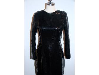 Get glammed up in this one-of-a-kind gown! The yards of black sequins make for a very dramatic look. The high neck and long sleeves make the dress look conservative from the front, but when you turn around, the open back brings the "wow" factor! The dress is estimated to be between a size 4 and 6.