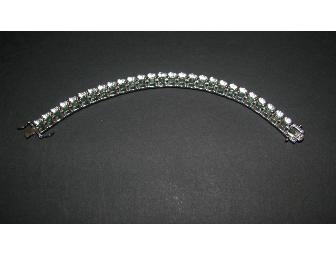 This stunning bracelet features a strand of faceted emeralds accented by diamond pave. The bracelet measures approximately 7" long, 3/8" wide. Sterling silver clasp. This is a beautiful piece for a formal night out, but would be equally fashionable for a business look. Value: $80