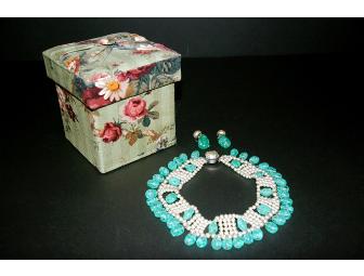 This unique French vintage choker is an astonishing accessory. Made of green glass beads and faux pearls, this necklace and earrings set is dated circa 1920-1930. Silver plate finish and detailing on the clasp. Choker necklace measures approximately 13.5" long, 1" wide with hanging beads. Clip-on earrings measure approximately 1.5" long. Value: $120