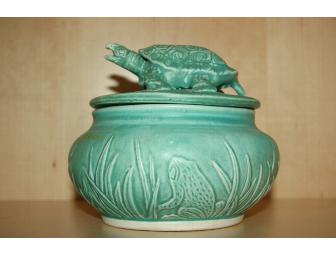 This hand thrown jar is a one-of-a-kind piece of pottery that would make a great addition to any home decor. The jar is in an antiqued sea green color decorated with images of turtles and frogs. The lid features a 3-dimensional turtle that doubles as a handle. Jar measures approximately 6" high with lid and 7" in diameter at its midsection. Value: $150