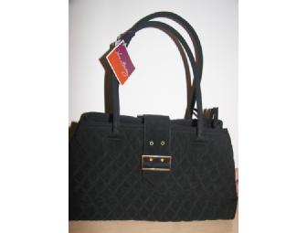 This beautiful Vera Bradley black microfiber quilted satchel is the perfect handbag for all occasions! The satchel features 3 large compartments with zip closures and a magnetic buckle closure. The 2 outer compartments include smaller interior pockets and the satchel has 1 exterior pocket. The satchel measures 12.5" L x 6" W x 8" H with 2 handles and an 8.5" drop. Value: $80