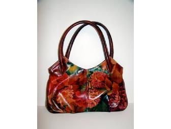 This festive floral purse is the ideal companion for a summer outing. Made in Argentina, this leather handbag features a single compartment with zip closure and one interior zip pocket. Also includes two exterior pockets, each with a magnetic snap closure. This stylish handbag has a floral print on the exterior and a black fabric interior. Measures approximately 13" L x 7" H x 3" W. Value: $120
