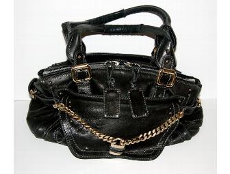 Be a "Chloe girl" with this black leather handbag. This shoulder bag is embellished with silver chain and lock details. The silver buckles on the straps allow for a custom fit. Inside, several pockets will help you organize the contents of your purse.  Handbag is previously owned, but is in great condition. Some wear on handles as indicated in images; however, leather is unscratched and interior is clean.