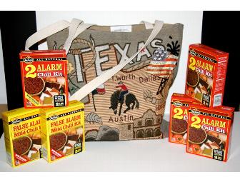 Be ready for the cold nights of winter with this chili package! Included are twelve boxes of Wick Fowler's 2 Alarm Chili Kit and two boxes of his all natural False Alarm Chili Kit, both containing an array of chili spices to give your pot of chili that extra kick. The Chili Kits are housed in a lovely lacquered woven bag depicting all things "Texas"--a cowboy boot, a bull rider, a yellow rose, and The Alamo.
