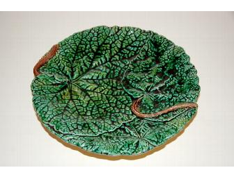 This lovely platter would be perfect to display hors devours at your next house party! Majolica is brightly colored, tin-glazed earthenware ceramic that became popular in Britain in the 1850s. The intricate leaf pattern on this Majolica platter is tinted in multiple colors of vibrant green. Echoing the leaf theme of the platter, the stand features several leaves encircling the base of the piece.