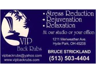 Reclaim your calm with this 60 minute table massage at VIP Back Rubs! When it comes to getting a massage in Cincinnati, residents know that VIP Back Rubs is the place to go. This massage will help you relax, eliminate stress, and allow you to leave your appointment feeling centered, focused, and ready to take on the world! VIP Back Rubs is located in Hyde Park. Reservation required. Certificate expires January 20, 2012. Value: $60