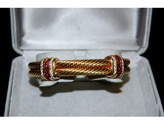 David Yurman truly changed the world of fashion with his twisted cable-inspired pieces, and you can share in his collection with this stunning gold, ruby, and diamond cuff bracelet! This bracelet is an 18K yellow gold cable cuff accented with two gold wraps, each displaying gorgeous rows of rubies and diamonds. Cuff fits a small to medium wrist.