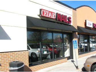 Cedar Nails located in the Cedar Hills shopping center, specializes in manicure and pedicure services. The store is bright and open with large front windows. Walk-ins are welcome but appointments are recommended